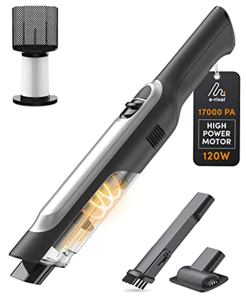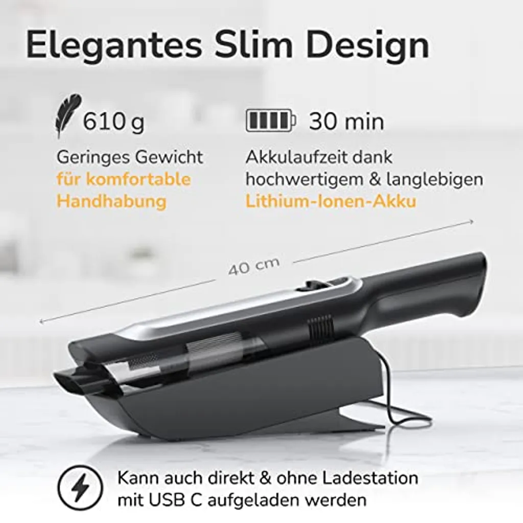 Erstaunlich, welche Saugkraft der handliche a-rival HS950 Akkusauger entwickelt: Der langlebige, leistungsstarke Lithium-Ionen-Akku versorgt den hochmodernen Motor für bis zu 30 Minuten zuverlässig mit Energie. So können Sie zwischendurch bequem kabellos saugen. Das geringe Gewicht von nur 610 Gramm und der gut ausbalancierte Schwerpunkt erhöhen den Komfort zusätzlich.