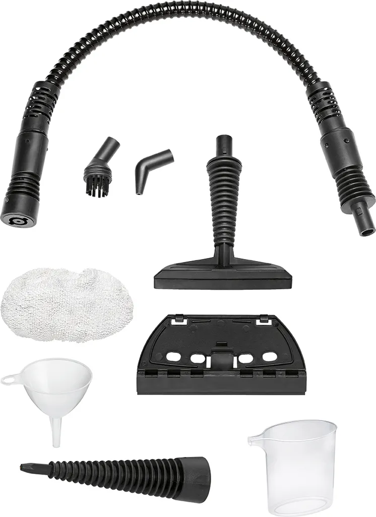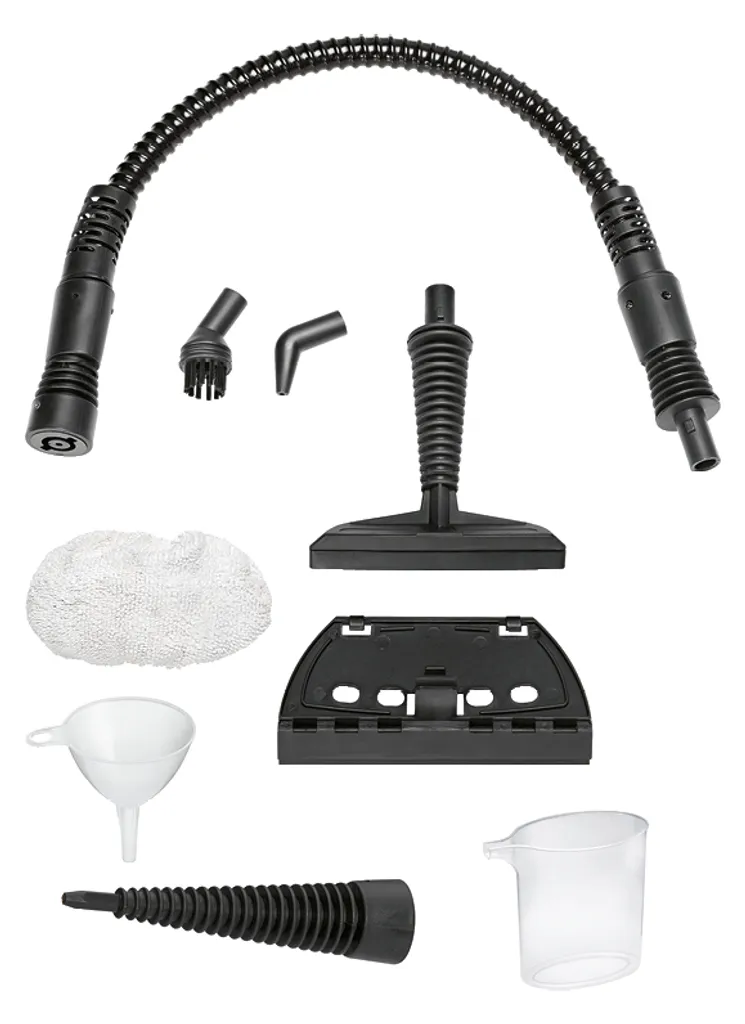 Lieferumfang — Mit insgesamt 9 Zubehörteile sind Sie für eine gründliche Reinigung gerüstet, egal ob es sich um eine große Fläche oder eine kleine Lücke handelt: Bürsten‑, Winkel-, Vlies-, Fensterreinigungs- und universeller Reinigungsaufsatz, 360° schwenkbare Dampfdüse, Schlauch, Messbecher, Trichter.