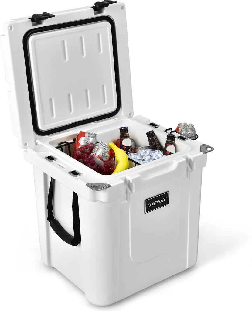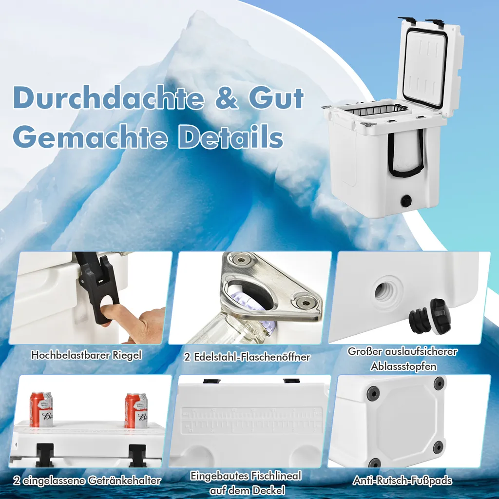Dank der unverwüstlichen rotationsgeformten Konstruktion und der hervorragenden Isolierleistung ist diese robuste Kühlbox ein perfekter Partner für alle Outdoor-Aktivitäten wie Grillpartys, Picknick, Angeln, Camping oder Selbstfahrerreisen. Die Oberseite unserer Eistruhe hält mehr als 200 kg stand, sodass Sie unbesorgt auf dem Deckel sitzen können. Eine herausnehmbare Trennwand, ein Aufbewahrungskorb und ein Getränkehalter sorgen für ein besseres Nutzungserlebnis. Darüber hinaus verfügt diese Kühlbox mit einem großen Fassungsvermögen von 31 Litern über 2 versenkte Getränkehalter, ein Fischlineal, Sicherungsverschlüsse, 2 Flaschenöffner aus Edelstahl, eine auslaufsichere Ablassschraube, 2 Tragegriffe und rutschfeste Fußpolster. All diese durchdachten Details machen es zu einem perfekten Kühler.
