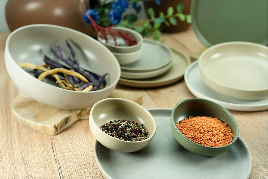 Das Geschirr präsentiert sich in einer weichen, harmonisch ausbalancierten Form in den Trendfarben Grün, Terra, Stein und Sand mit einer seidenmatten Spezialglasur.