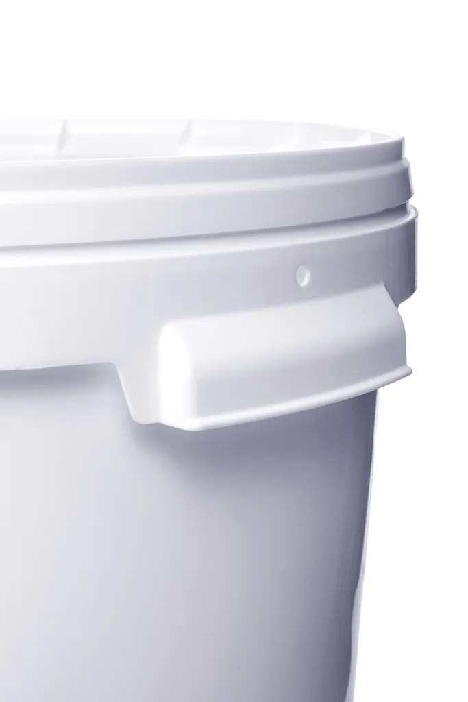 Der Eimer ist mit einem Verschluss und zwei Kunststoffgriffen an den Seiten ausgestattet, was ihn leicht zu transportieren und zu öffnen macht.