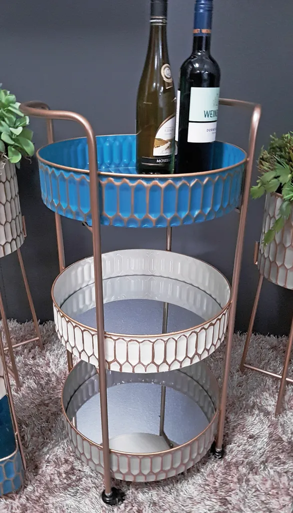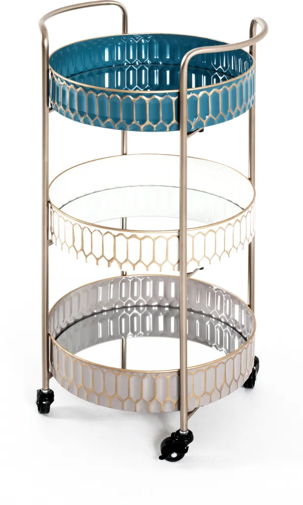 Dieser Beistellwagen ist aus robustem Stahl in Gold-matt lackiert. Auf drei Ebenen haben Sie die Möglichkeit Ihre Wohnaccessoires abzustellen. Die Ablagen sind aus Metall in gold-creme-petrol-taupe lackiert, in den Ablagen sind je eine wertvolle Spiegelplatte innenliegend. Durch seine Leichtlaufrollen lässt sich der Wagen in Ihren Räumen individuell verschieben. Sie werden diesen Tisch lieben, denn er verschönert jedes Heim. Sie können mit diesem Wohnaccessoires, Ihren Räumen immer wieder ein neues Gesicht geben.