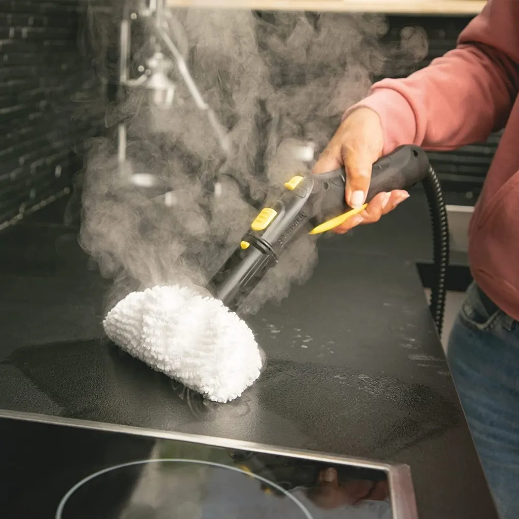 Bei gründlicher Reinigung mit dem Kärcher Dampfreiniger werden bis zu 99,999 % der viren und 99,99% aller haushaltsüblichen Bakterien auf haushaltsüblichen Hartflächen beseitigt. Mit dem vielfältigen Zubehör lassen sich Fliesen, Kochfeld, Dunstabzugshaube und sogar kleinste Ritzen hygienisch reinigen – hartnäckiger Schmutz inklusive. Mit dabei ist auch die EasyFix Bodendüse mit flexiblem Gelenk für höchste Ergonomie und Lamellentechnologie für perfekte Reinigungsergebnisse. Durch das komfortable Klettsystem lässt sich das Mikrofaser-Bodentuch mühelos an der Bodendüse fixieren und ohne Schmutzkontakt entfernen. Die 2-stufige Dampfregulierung lässt sich perfekt an die Oberfläche und den Schmutz anpassen.