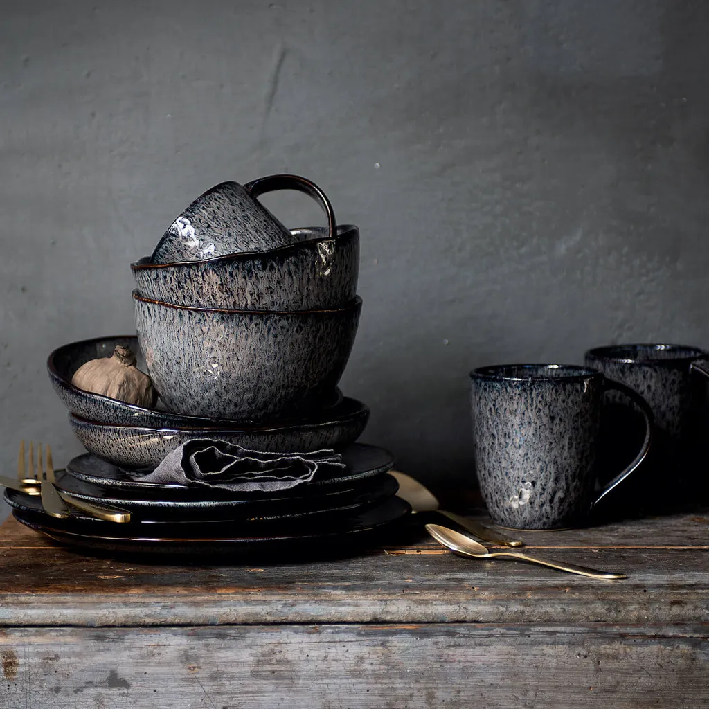 Die handaufgetragene Effekt-Glasur ist widerstandsfähig, langlebig und zaubert Extravaganz auf den Tisch. Dank einfacher Reinigung in der Spülmaschine erweist sich das Geschirrset als besonders robust und alltagstauglich. Auf den Tellern und in den Schalen können Speisen schnell in der Mikrowelle erhitzt werden. In kleineren Schränken findet das Geschirrset gestapelt sehr gut Platz.