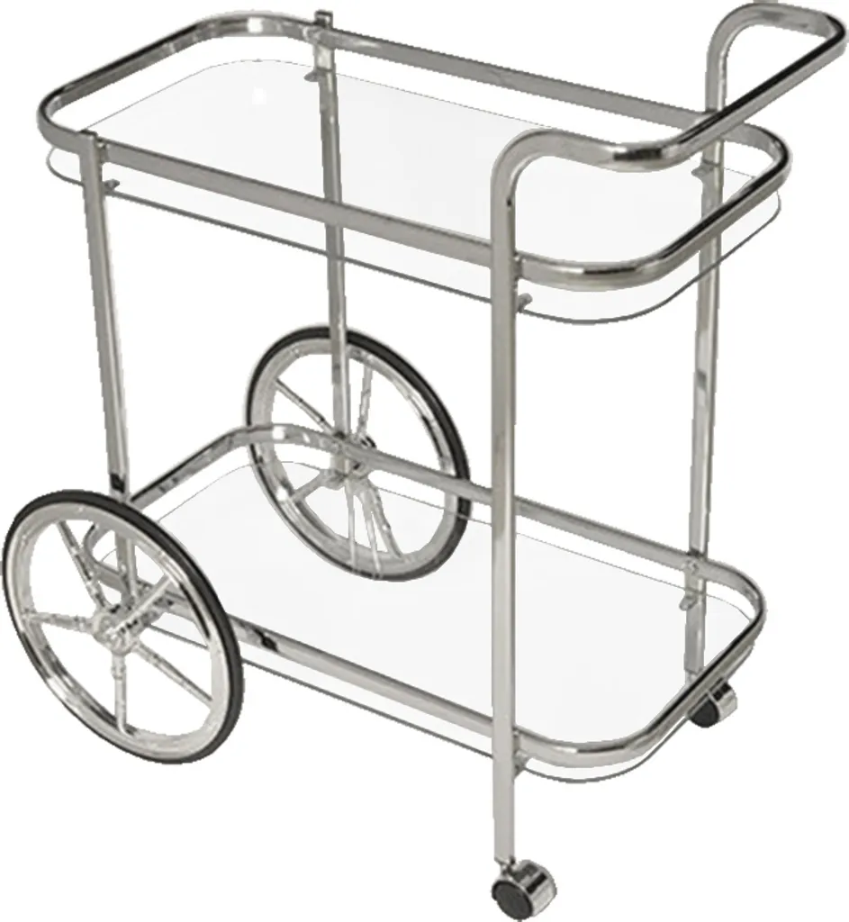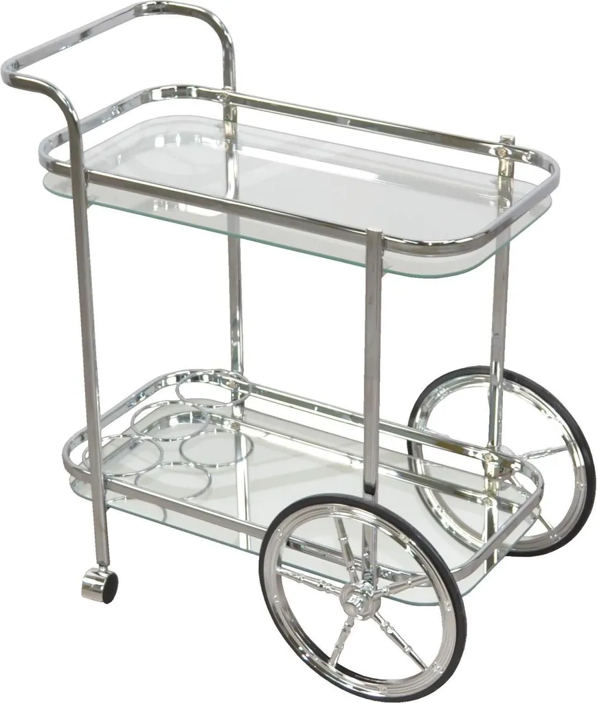 Aus Stahlrohr mit einer hochwertigen, trendigen Oberfläche, chromfarben. 2 Sicherheitsglas-Abstellflächen aus Klarglas, unten mit 3 Ringen für z. B. Flaschen. 2 große Räder und 2 kleinere Rollen, sorgen für die praktische Funktionalität. Ideal wenn man Gäste hat, egal ob für hochprozentiges oder für Tee/Kaffee, Gebäck und Kuchen. Maße ca. cm: B. 73 x T. 38 x H. 74 cm