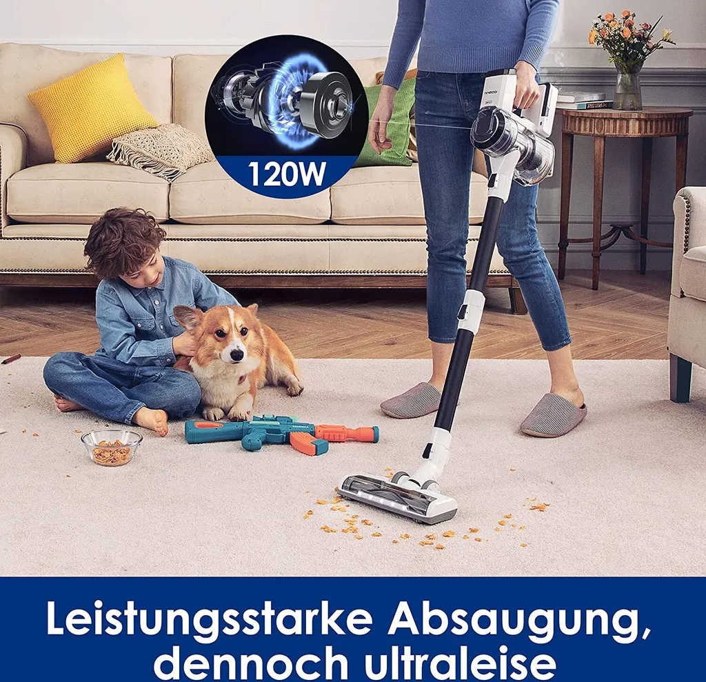 - 3 Leistungsmodi – Der Max-Power-Modus liefert bis zu 120 W starke Saugleistung für die Tiefenreinigung; Modus II liefert eine schnelle Reinigungsleistung für kleine Reinigungsarbeiten, während Modus I für die tägliche Reinigung von Teppichen, Hartholzböden, Fliesen und mehr geeignet ist.
