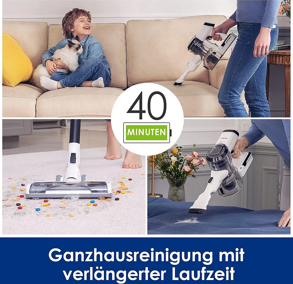 - Lange laufzeit – Der Akku kann bis zu 40 Minuten Betriebszeit liefern und geeignet für große Reinigungsaufgaben. Der größere Akku und die variablen Leistungsmodi ermöglichen eine 60 % längere Laufzeit als bei unserem kabellosen Staubsauger A10 Hero.